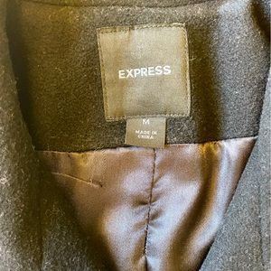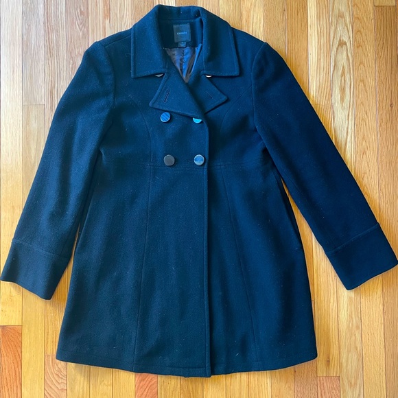 Express black buttoned long overcoat. Knee-length, double-breasted with pleated babydoll back. Super warm. Excellent condition (only worn on a few special occasions).