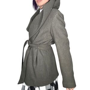 This Express wool blend wrap coat has a trench coat vibe w/an oversized shawl collar that doubles as a hood. It’s actually a military green color. It’s in good condition but it’s missing the inside buttons. IMO you don’t really need them.