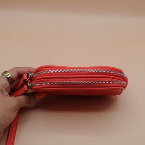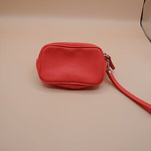 Small express wristlet. Leather feel although I think it’s synthetic leather. Pink with silver hardware. Used only a handful of times and in great condition. Small enough that it won’t fit your phone but can fit keys, cards/cash, lippie, mirror, some gum.