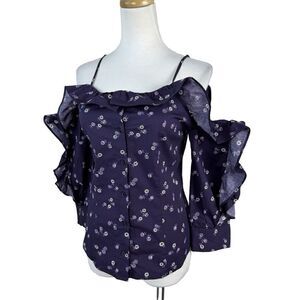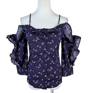 Express XS Purple Blouse Open Ruffle Sleeve Floral Button Front Fitted