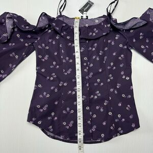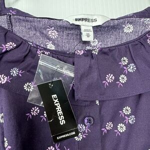 This beautiful blouse from Express is a must-have for any fashion-forward woman. With a stunning purple color and floral pattern, it is sure to turn heads. The button front and spaghetti straps add a touch of elegance, while the cold shoulder sleeves and ruffle accents give it a playful vibe. Made from a blend of spandex and cotton, it is both comfortable and stylish. Perfect for any occasion, this blouse is a wardrobe staple that you won't want to live without.