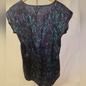 Express women’s blouse size XS. Features a vibrant chevron print in blue, purple, and black. Short sleeves, lightweight fabric, and a relaxed scoop neck fit. Perfect top for work, office, casual wear, or going out. Pairs easily with jeans, skirts, or dress pants for versatile styling