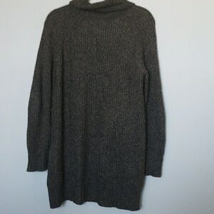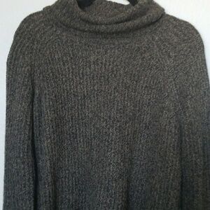 Mohair, wool, acrylic and nylon blend. Knitted sweater, very long in back, hi low style. Dark olive green with slight black marled color. Fabric does stretch. Oversized for a small, could fit a medium to large depending on how you like the fit. Minor wash wear.