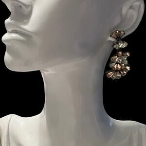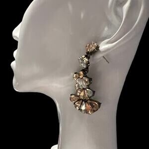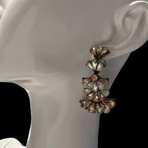 Make a stunning statement with these vintage Y2K Express dangle earrings featuring cascading crystal flowers. Each earring measures 2 inches in length, showcasing a graduated design of four flower clusters composed of teardrop-shaped rhinestones in iridescent and champagne tones. The antiqued silver-tone setting provides an elegant backdrop for the sparkling stones. These earrings perfectly capture the glamorous excess of early 2000s fashion while remaining timelessly beautiful. The secure post backing ensures comfortable wear, while the dramatic length creates an eye-catching effect. These statement pieces transition effortlessly from day to evening wear. Excellent vintage condition with all stones intact and original Express branding.