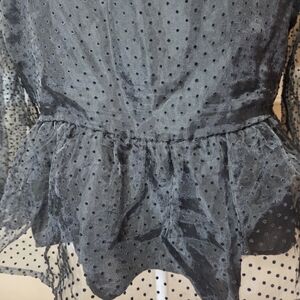 This elegant black top features a sheer polka dot design, perfect for adding a touch of sophistication to any outfit. Ideal for both casual and formal occasions.