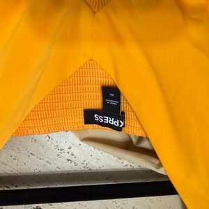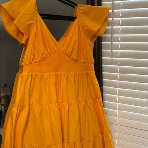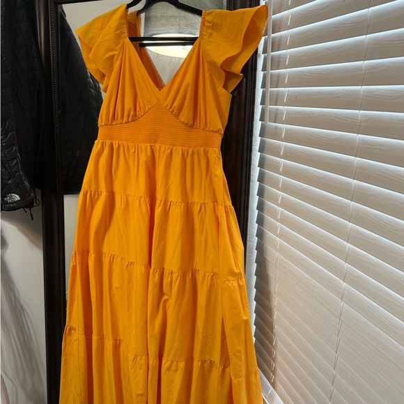 Step into elegance with this vibrant yellow maxi sundress from Express, perfect for a wedding guest or cocktail occasion. Featuring a flattering V-neckline and flutter sleeves, this dress combines a ruffled, smocked waist for a romantic silhouette. Its flowing design and sunny hue make it a standout choice for any special event.