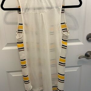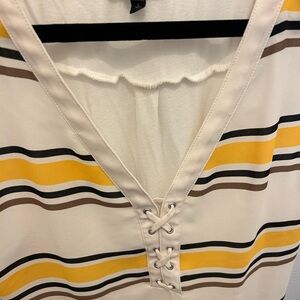 V-neck tank with yellow and brown stripes. Lace-up front detail. Ideal for summer wear.