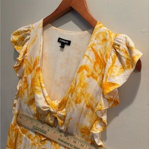 This stunning sundress by Express is designed for warm weather occasions, featuring a vibrant yellow and white palette. The dress boasts a flattering v-neckline and flutter sleeves, with a ruffled, tiered maxi skirt that adds elegance and movement.