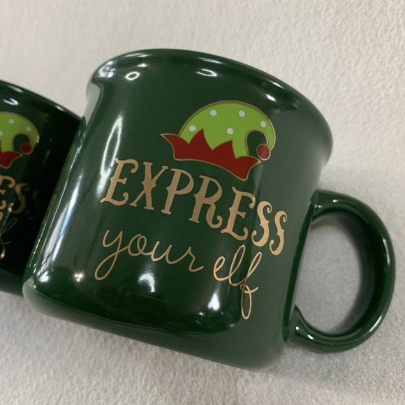 Express Your Elf Mug Green Ceramic Coffee Tea Cocoa Large 2 Pc Set Santa Helper Gold