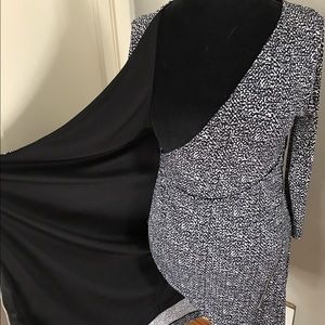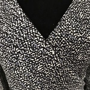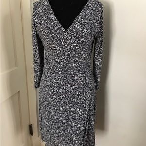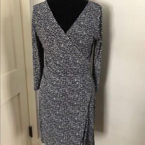 Very flattering wrap dress with zipper detail on left side. Three quarter sleeves with v neckline. Hits around mid thigh. Can be worn at work or night out.