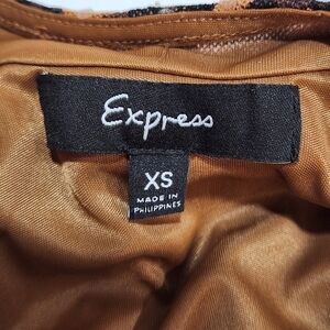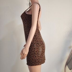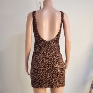 This is the perfect party dress. The material is stretchy and lined for a comfortable fit. The clear sequins are embellished all over the dress and catch the light beautifully. It is sleeveless with a scoop neck and an open back. The animal print is fun and festive.