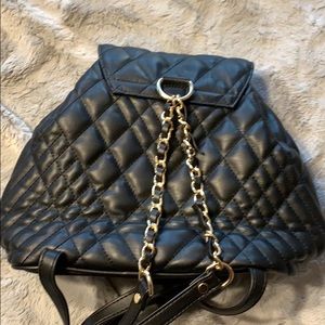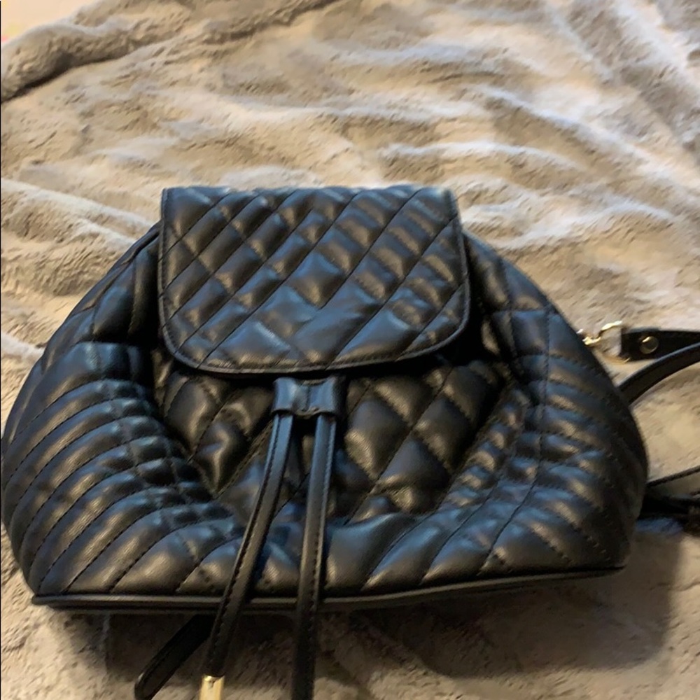 Black back pack with gold straps in the back has a zipper pocket on the inside