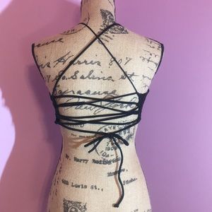 Adorable cross chest express black bathing suit top. Has padding already in it and can be taken out. Also the straps are adjustable and can be threaded through the rings in the back like a shoe lace allowing you to make the straps as long or short as you want