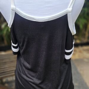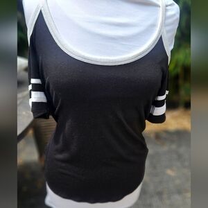 Express black and white cold shoulder top w racing stripes cool & comfortable