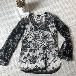 [Express] black and white tunic. Sheer material with black and white floral pattern. Sequin detail on neckline and cuffs (see pics). Excellent used condition. Women’s size S