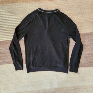 Black cardigan with V-neck. Gray piping along lapel and collar with gray buttons. Two pockets in front.