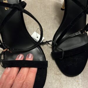 Express black heels w black velvety strap at the foot, ankle, Gold stiletto heel