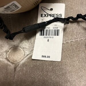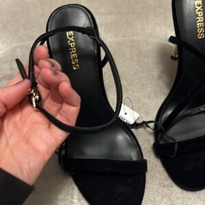 brand new with tags. This is a gorgeous pair of express brand shoes. These are high heels with a gold stiletto heel and it measures 4 1/2 inches from the top of the shoe to the floor. The gold part is about 3 1/4 inches. The front features a black sueded/velvety strap at the foot and an adjustable ankle strap. there is a fair amount of cushioning in both the bottom and the heel so they should be pretty comfortable. We thought we were buying a size 8 and we bought a size 6 and could not return them. Simply beautiful shoes.