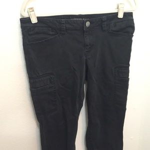 Express black pants. Pockets on thigh area, zippers on bottoms of pants on the side. Low rise. Ankle-leggings