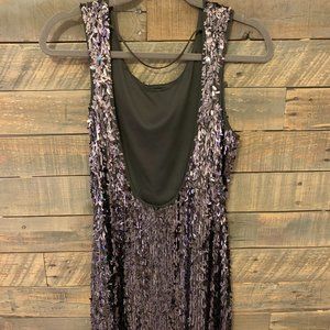 Excellent condition, no pilling, holes or missing/loose sequins. Dark grey/black colored sequins. Scoop neck style, fabric does stretch and open back. Front is completely lined so no scratchy sequins! Great going out dress (especially New Years) and would look adorable with a distressed denim jacket over!