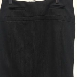 Express business casual, very professional black skirt with thin white stripes. Have worn 1 time. Still looks brand new. Has zipper in back and black clasp. Perfect for work or a business casual event. Has sewn in black slip on the inside of the skirt. Length 17 1/2 inches.