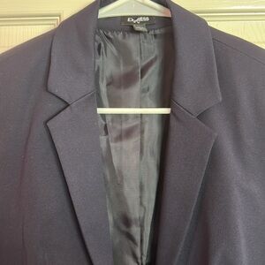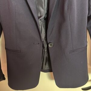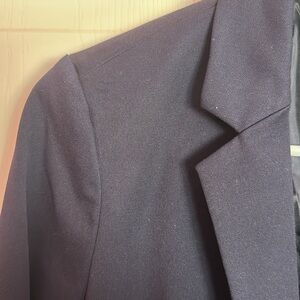 Polyester blend. No shoulder pads. Wore once for business photos. 24 inches from shoulder to him. Navy blue color.
