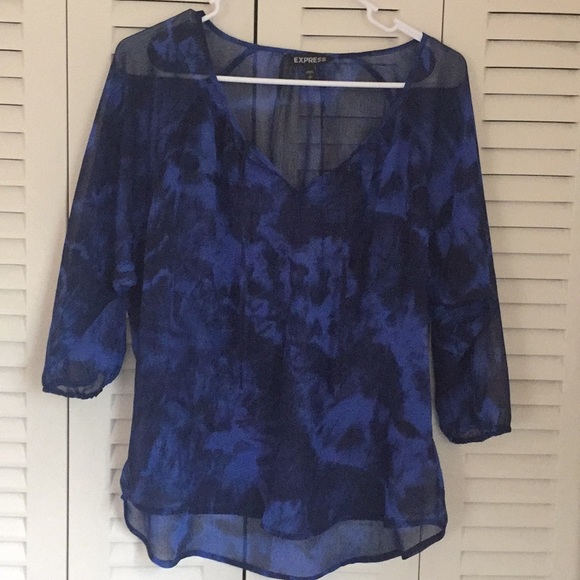 Flowy sheer blouse, 3/4 elastic sleeves, vneck with strings, blue tie dye pattern, NWOT.