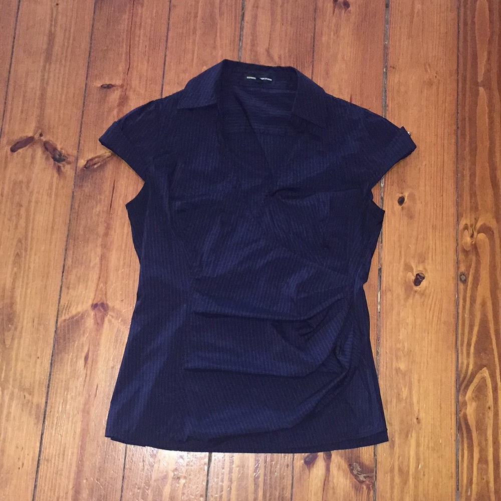 Black with Blue stripes. Gathers at the side and hides your midsection wonderfully. Side zipper.