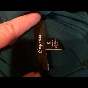 This Express blouse has a gorgeous tie that can be adjusted and ties different ways on the side of the top. The materials is a thick, stretchy deeply colored material- I couldn’t seem to do the color justice...it is a stunning rich tealy blue. I wore this once for a job interview and totally got the job.