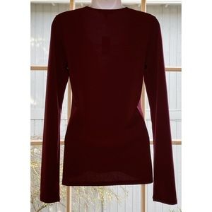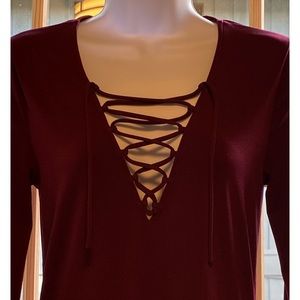 NWT Express blouse with lace up front. Color is a deep maroon. Structured and sexy. Polyester and spandex materials make this shirt comfortable and form fitting.