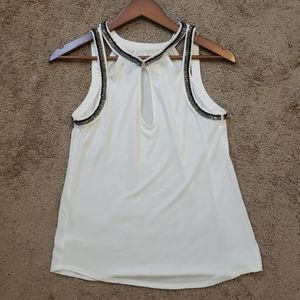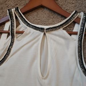 Express white blouse with beaded trim on neck and arm holes. Super flattering cut. Great condition.