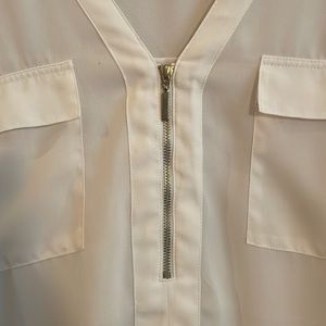 Description: Dressy zipper blouse with rolled sleeves and two pockets. Slightly sheer.