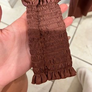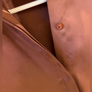 Burgundy colored blouse from express with fitted sleeves at the wrist. Small marks on the shirt that will come out when dry cleaned. Honestly you can hardly see them when you’re wearing the shirt, which is why I never got it dry cleaned. Lightly worn, less than 5x. Super cute on!