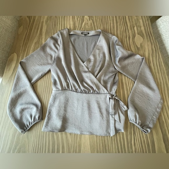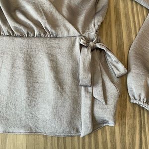 Size small, like new. Gorgeous color, gray / silver. The faux wrap is secured with stitching and has fabric for a tie / bow. Sleeves are elastic, and there’s elastic along the waist as well (this makes the waist semi peplum style).