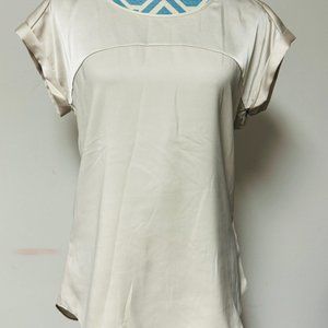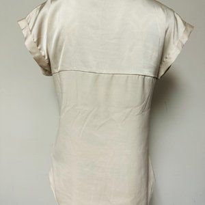 Introducing our elegant Express blouse in a neutral beige, a versatile size S addition to your wardrobe. Crafted from a blend of high-quality materials, this blouse offers both comfort and durability. The chic design features a smooth, satin-like panel across the chest, adding a touch of luxury. Its short cap sleeves are perfect for a professional look or a casual outing. The blouse boasts a subtle sheen and is cut to flatter with a relaxed fit that skims the body for graceful movement. The rear zipper closure ensures a seamless fit. Easy to care for and ideal for both day and night wear, this blouse pairs beautifully with skirts and trousers alike. Elevate your style with this must-have piece.