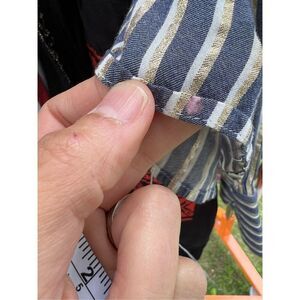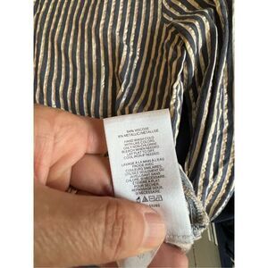 Express size small blue/gray, gold and cream, c striped blouse, viscose and metallic. One small flower, as pictured looks like it might be a tiny bleach spot, not noticeable when wearing ,pit to pit 16.5 inches, shoulder to bottom 22 inches, sleeve length 24.5 inches.