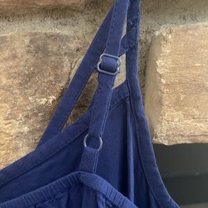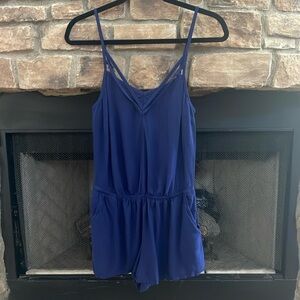 Express blue romper with pockets and adjustable straps. Size XS. Approximate measurements are 14 pit to pit and length from shoulder is 31
