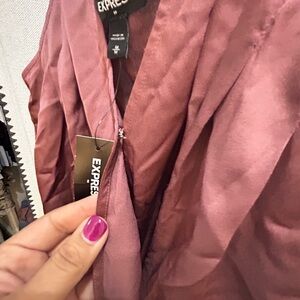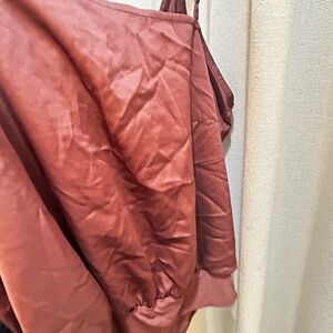 This bodysuit can be worn with black pants or jeans. It has a small hook by the bust for additional coverage. Never worn just don’t mind the wrinkles. It’s nothing that an iron or steam iron can’t fix. Color is more of a rose color and material is satin with cotton at the bottom.