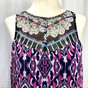 Express bohemian lightly crinkle gauze chiffon maxi dress (as seen on Alessandra Ambrosio). Single button closure at keyhole at back, high sheer neck, half slip and sheer below. Mandala and lace-look flounce at bottom matches top of bodice. Dress gets wider as it goes down, in a subtle trapeze shape for good draping.