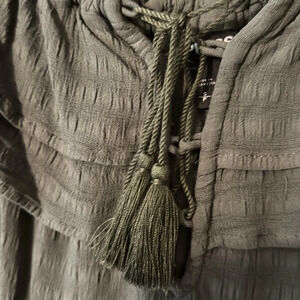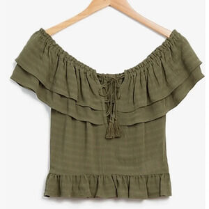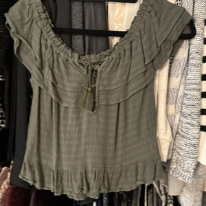 Olive green ruffled lace up top.20” across bust and 20” long. Rayon.