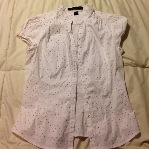 White with pink polka dots, button up, slim fit, goes great with jeans for casual wear or dress it up with a skirt