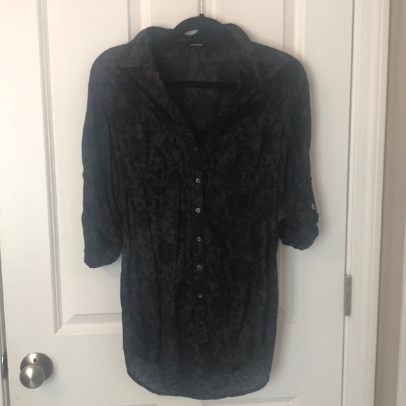 Button down from Express. Dark gray with black floral/lace print. Perfect with tights and boots! In great condition.