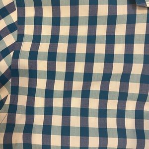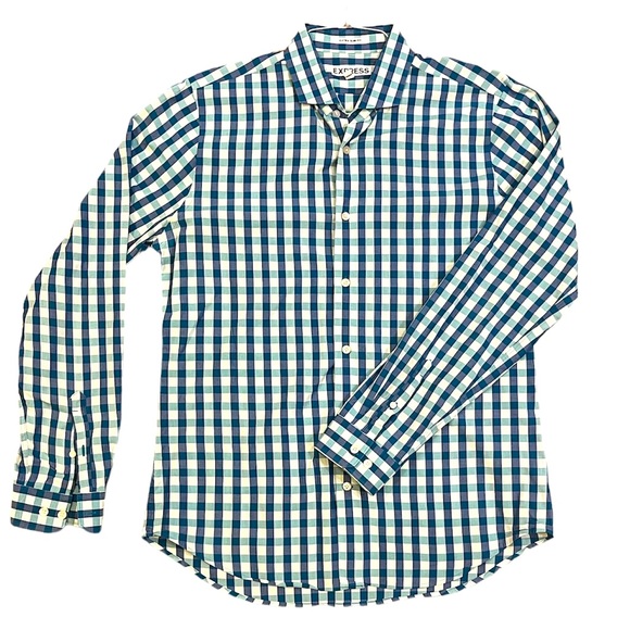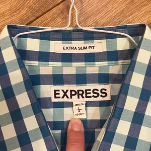 Express button down Blue/green checkered print Size L Extra slim fit Excellent for Smoke free home