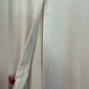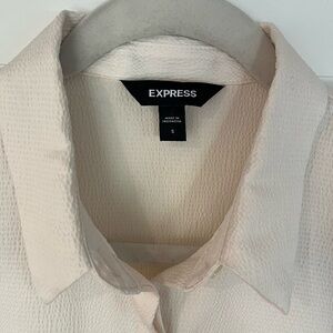 Beautiful cream textured Express blouse with hidden button closures for a seamless look. Detailed cuffs on arms with covered buttons. Lightweight, but not sheer