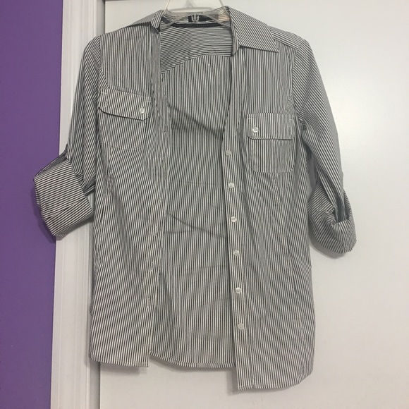 V Neck button down navy blue stripe size xs 3/4 sleeve with optional roll down