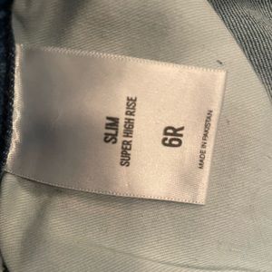 Express Ultra High Rise. Button fly. Raw hem. Straight leg. Light blue denim. Hole in right knee.