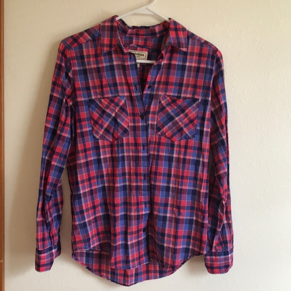 Very gently used shirt from Express. Super comfortable but have only worn a handful of times. Fun mix of pinks, purples and blues with convenient buttons on the arm so you can conveniently roll the sleeves. All buttons are attached, no holes, rips, or signs of wear and tear.