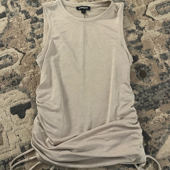 Express sleeveless tank in a champagne with subtle sheen. Side ruching with adjustable ties for a fitted look. Soft, lightweight. Versatile piece for layering or wearing solo.