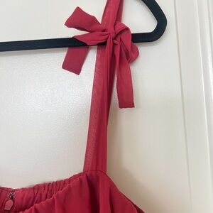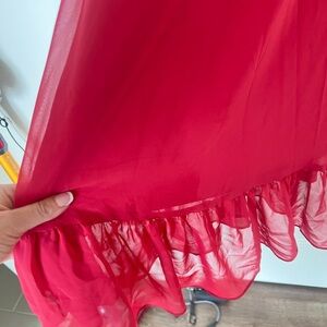 Elegant berry rust dress with ruffled details. Perfect for any occasion. Sleeveless design with a flowy skirt. Perfect for the upcoming holidays