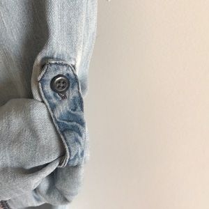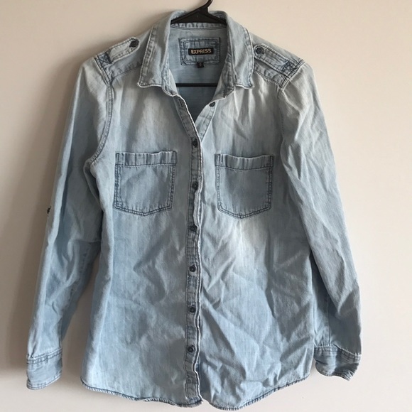 Express light denim button up. Size medium. 100% cotton. Good used condition. Two functional front pockets. Sleeves can be buttoned up or worn full length.